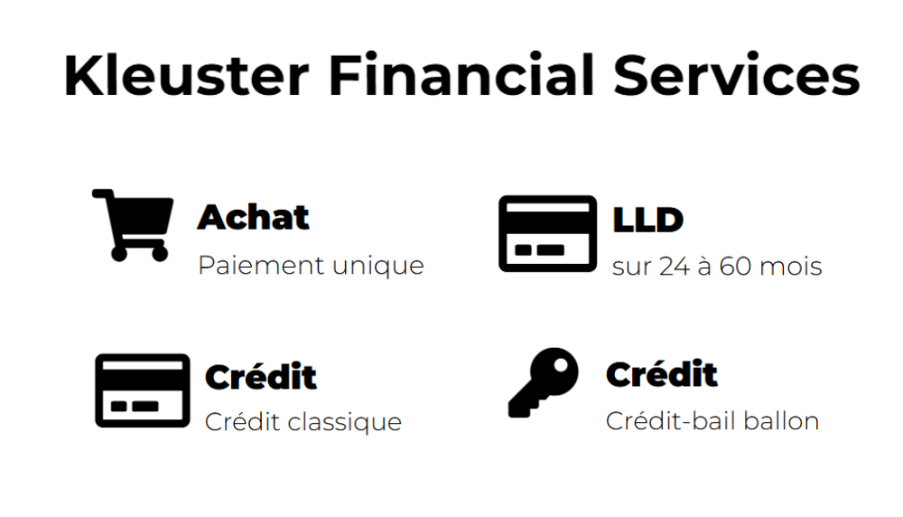 Offres de location longue durée réservées aux professionnels et applicables au marché français, sous réserve d’acceptation par Kleuster Financial Services, nom commercial de DRIVALIA Lease France – 1 rue Victor Basch – 91300 Massy – SA au capital de 68 954 580,86 € – 342 499 126 RCS Evry – APE 64.91Z – Courtier en assurance inscrit à l’ORIAS N° 12 066 654 consultable sur www.orias.fr. Vous disposez d’un droit légal de rétractation dans le cadre d’un crédit accessoire à une vente ou d’une Location avec option d’achat (LOA). Kleuster se réserve le droit de les modifier. Cette publicité est conçue par KLEUSTER – 158 RUE DES EPINETTES 73290 LA MOTTE-SERVOLEX – 885 143 586 R.C.S., qui est intermédiaire de crédit non exclusif de CA Consumer Finance et apporte son concours à la réalisation d’opérations de crédit à la consommation sans agir en qualité de prêteur ou bailleur.