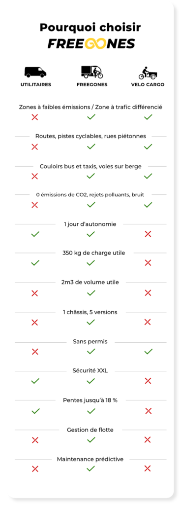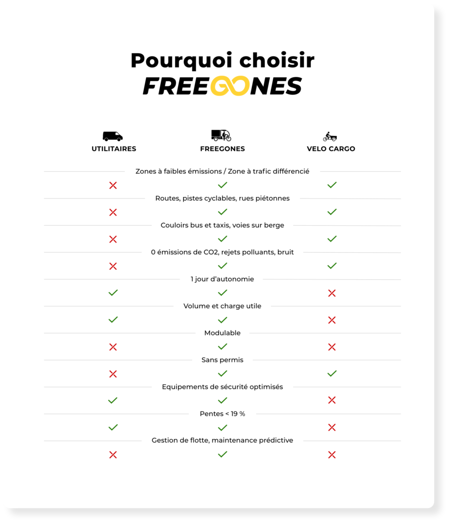 Accès facile à la ville, gain de temps pour se garer : grâce à ses dimensions compactes et sa maniabilité, Freegônes permet de se mouvoir en ville avec efficacité. Une agilité lui permettant d’être 60 % plus rapide qu’un VUL en ville. À ce gain de temps, s’ajoutent des économies en termes d’amendes, de carburant, ainsi que de sinistralité.